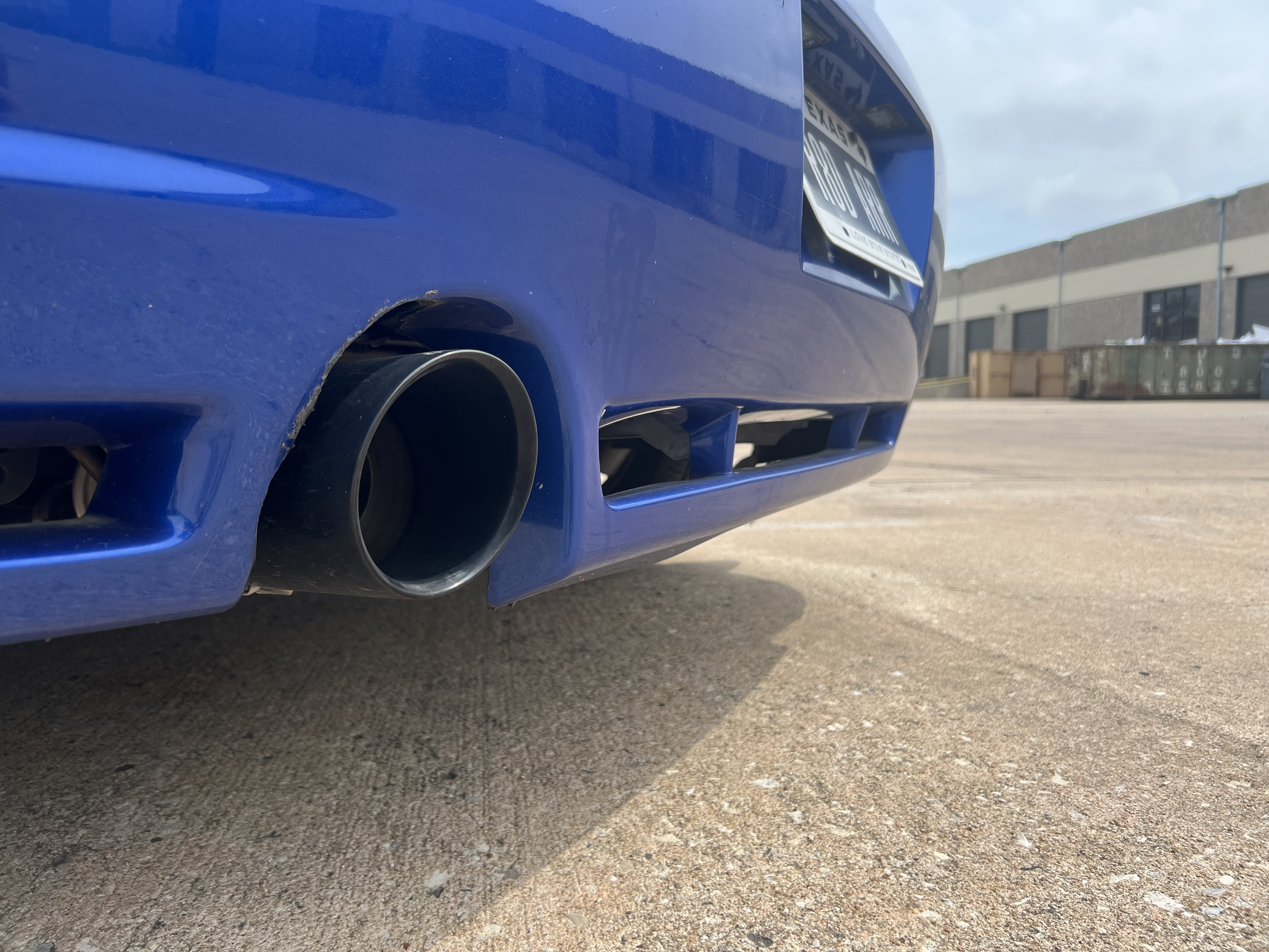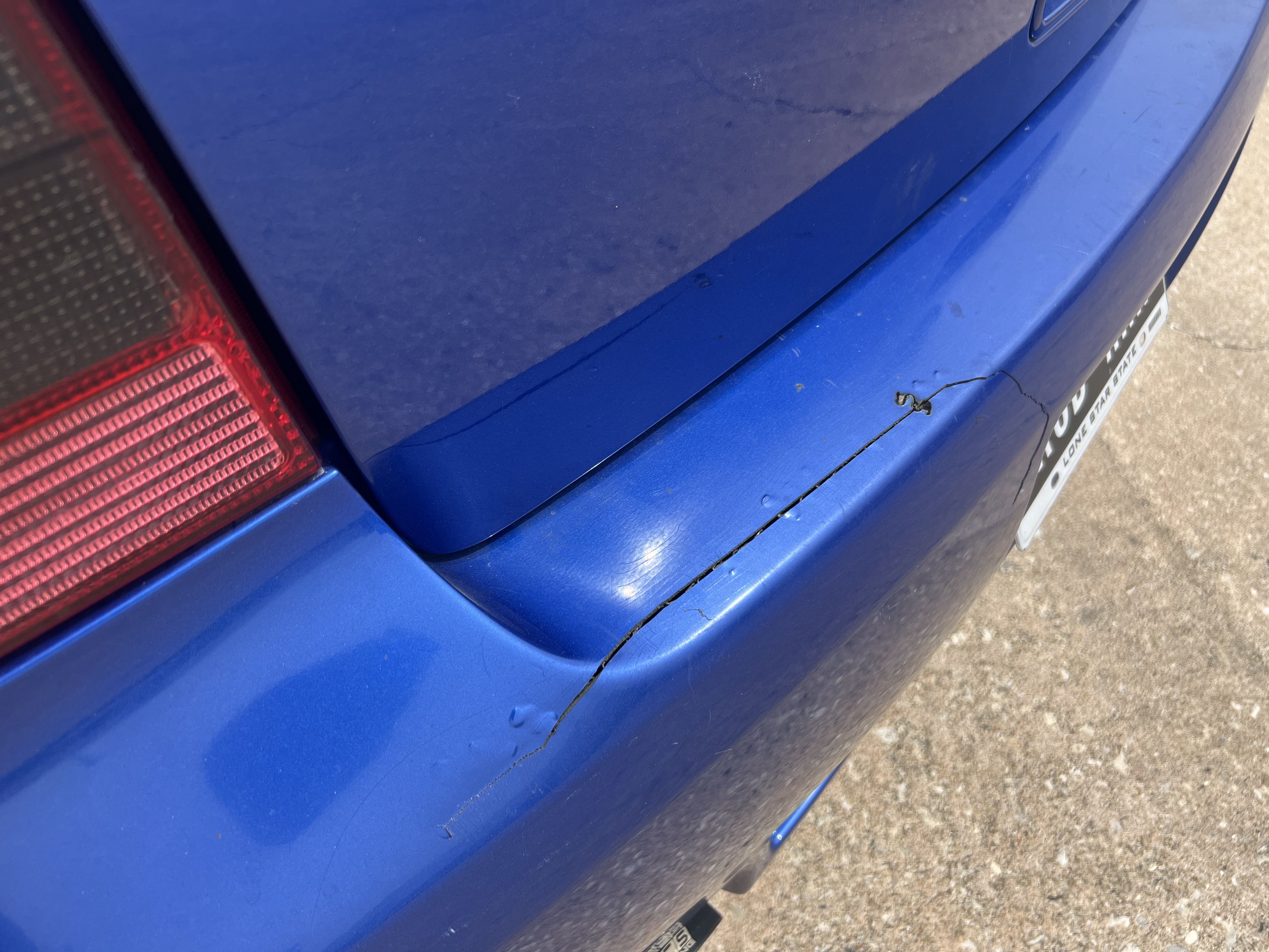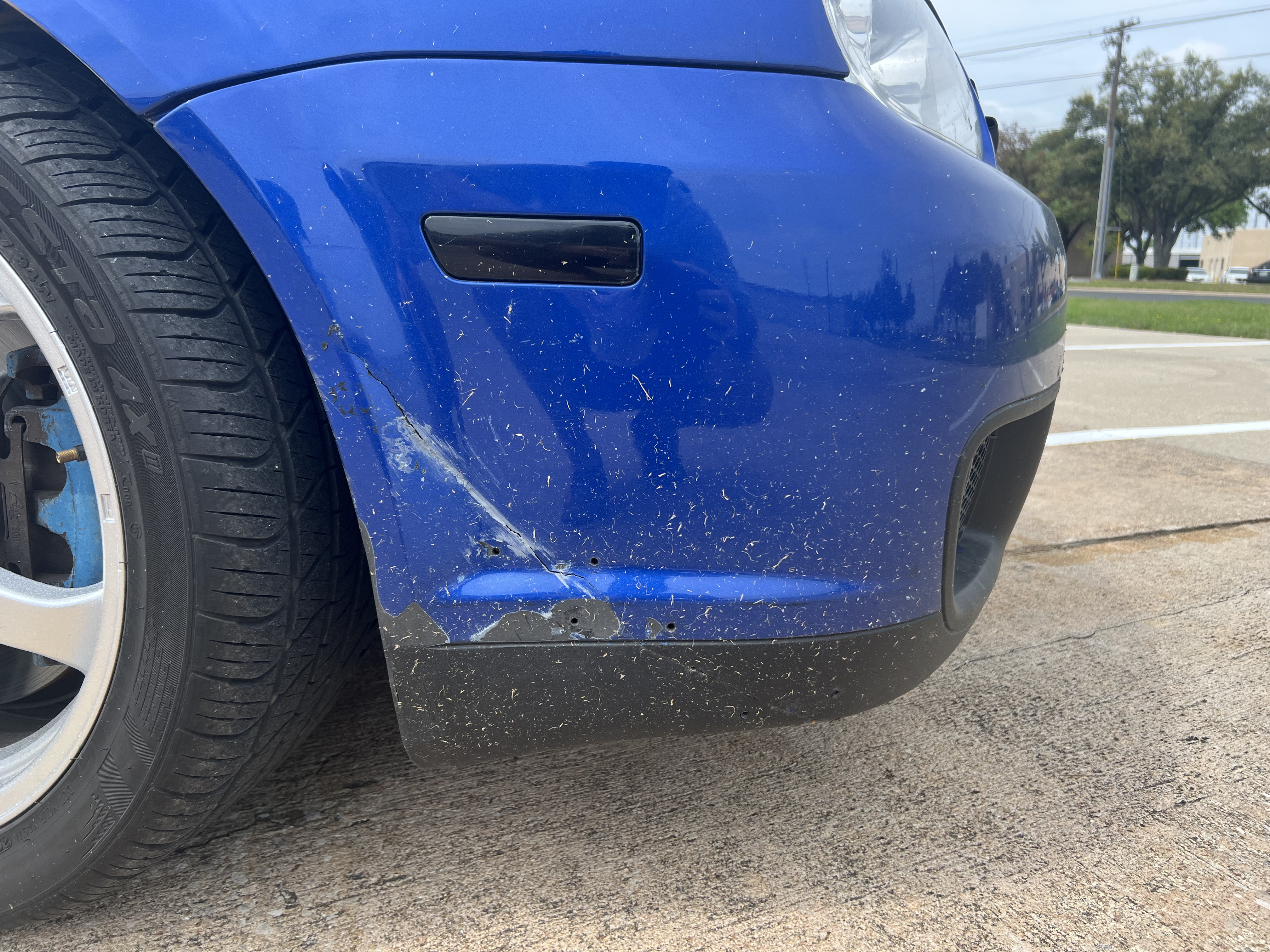 - Both bumpers have cracks/damage. The front bumper is cracked on the passenger side. The rear bumper is cracked (someone hit it while parked) and warped (heat from the exhaust coming off the hanger at a track day). Both bumpers still attach securely to the car at the original locations. They both stay in place on the car just fine, even at track speeds.