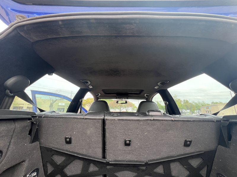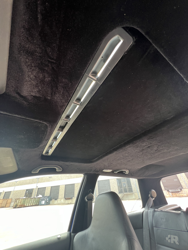 - Headliner and pillars recovered with black fabric. Pillars are fine, headliner near the front dome lights has a little sadness and saginess.